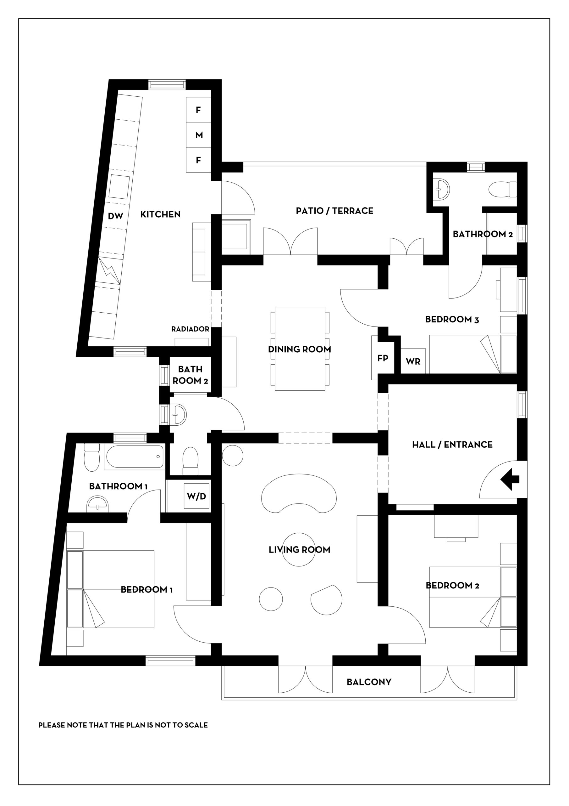 The apartment boasts high ceilings and an abundance of natural light, creating a bright and airy atmosphere throughout. The well-distributed layout features an inviting entrance hallway leading to three spacious bedrooms and three stylish bathrooms, offering both comfort and privacy.