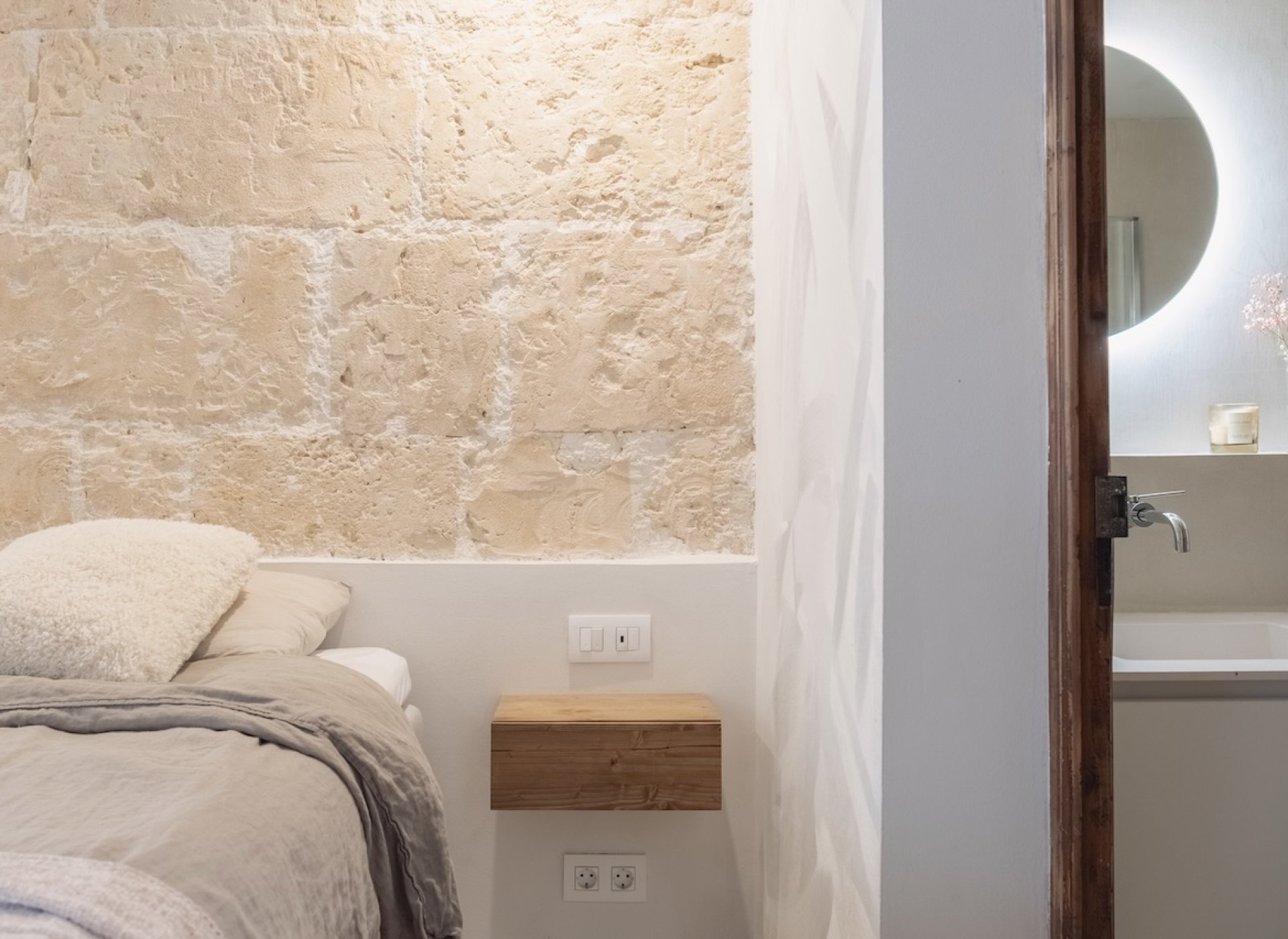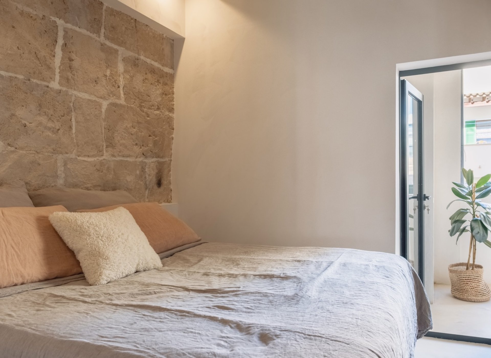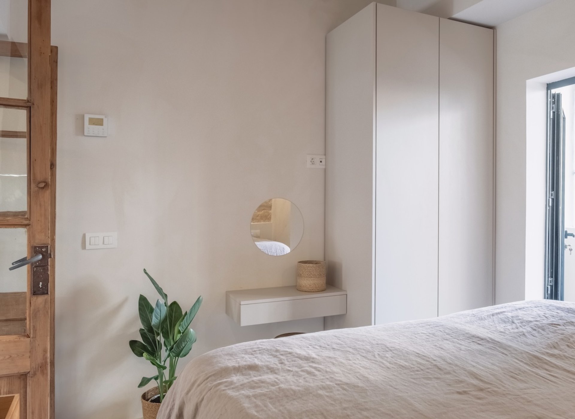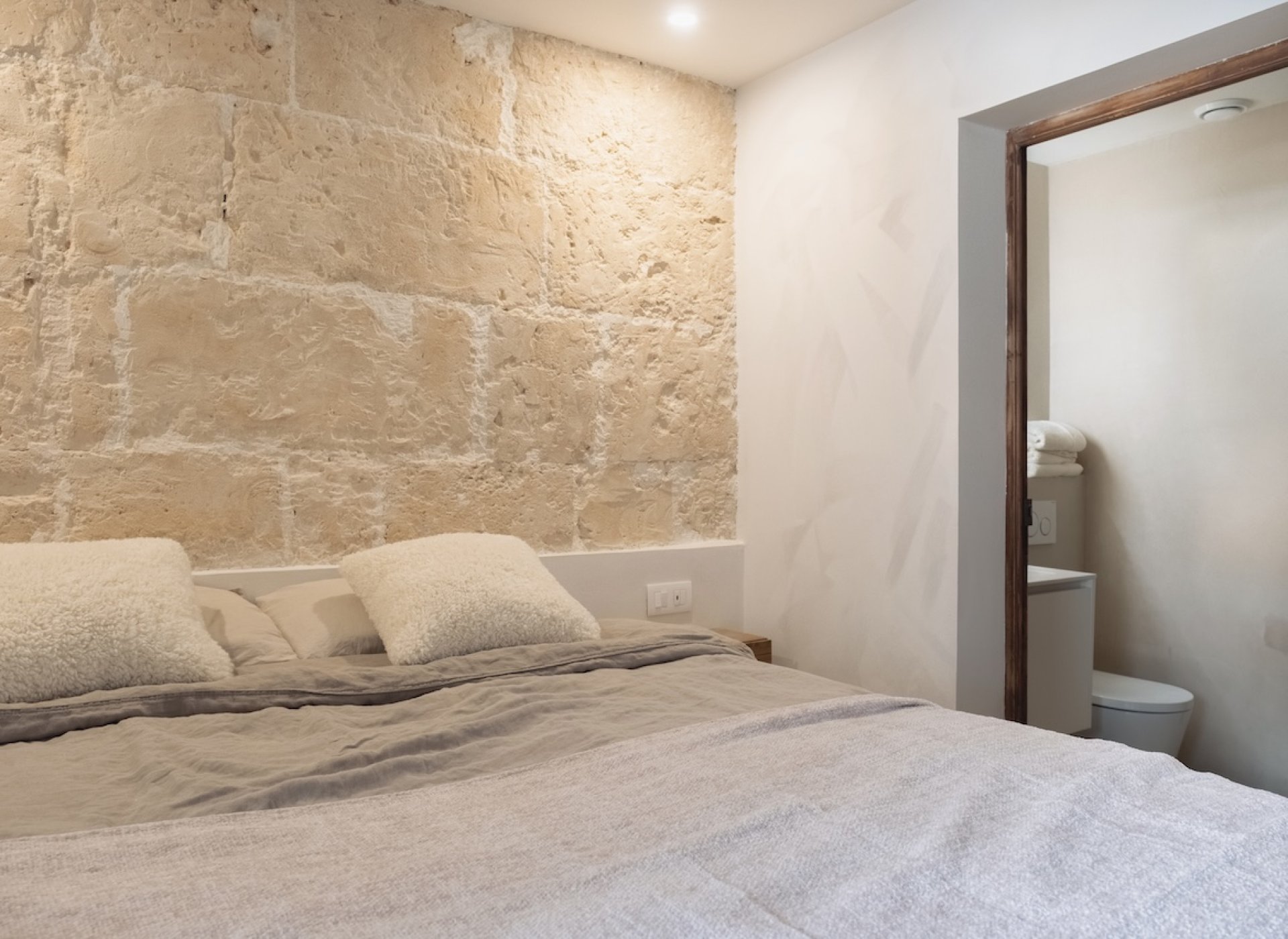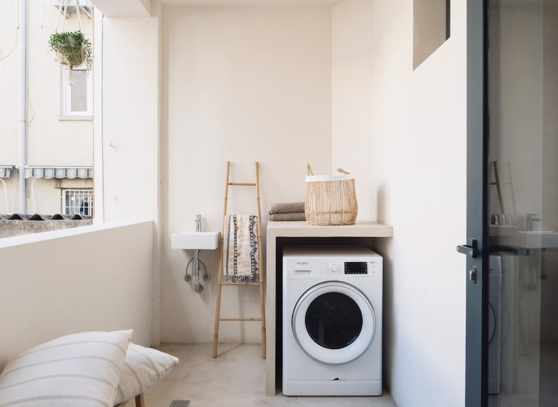 Both bedrooms open onto a quiet rear-facing terrace, where you will also find the laundry area—an ideal corner for morning coffee or evening relaxation. Original wooden door frames add warmth and authenticity, while air conditioning ensures year-round comfort.