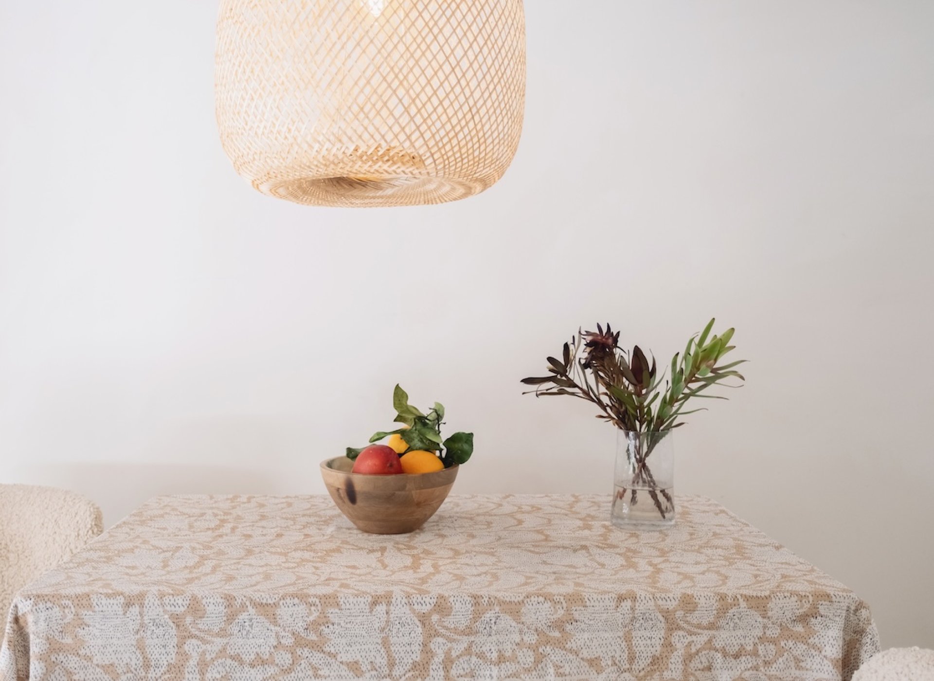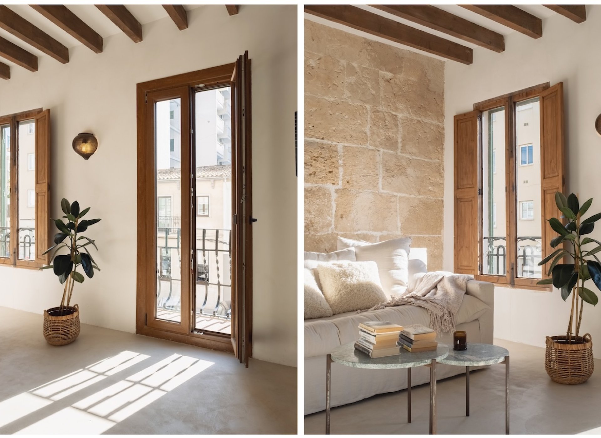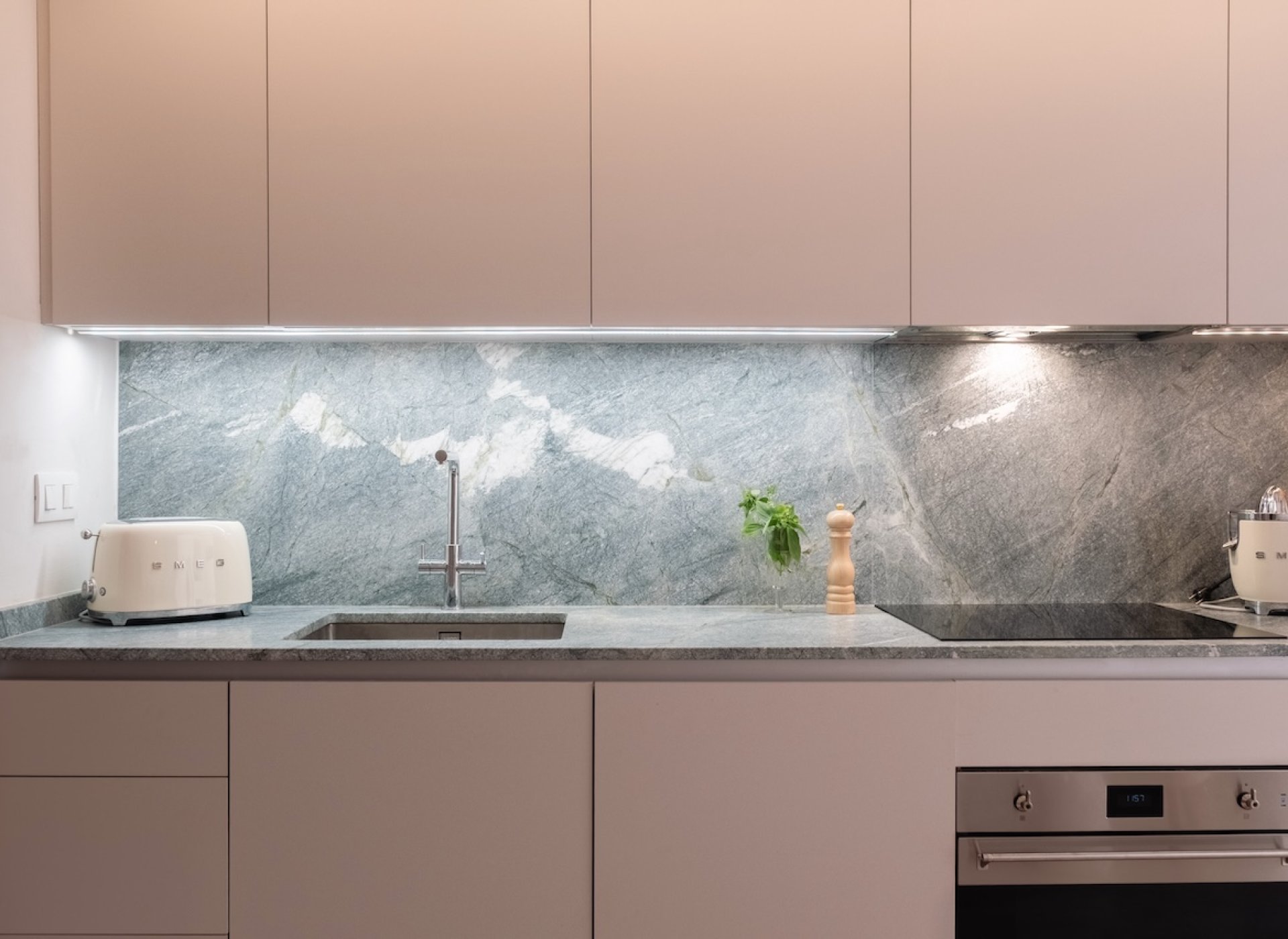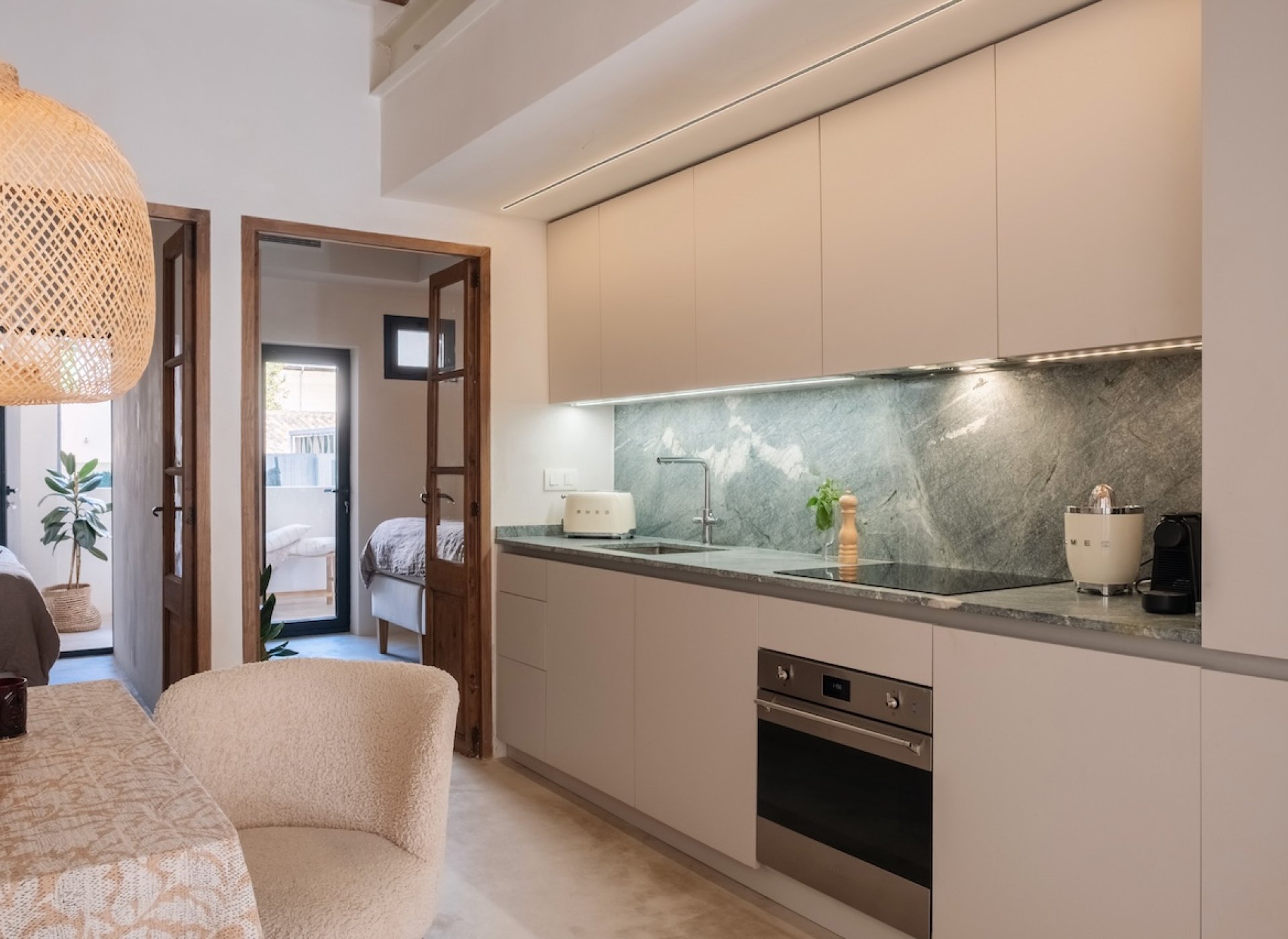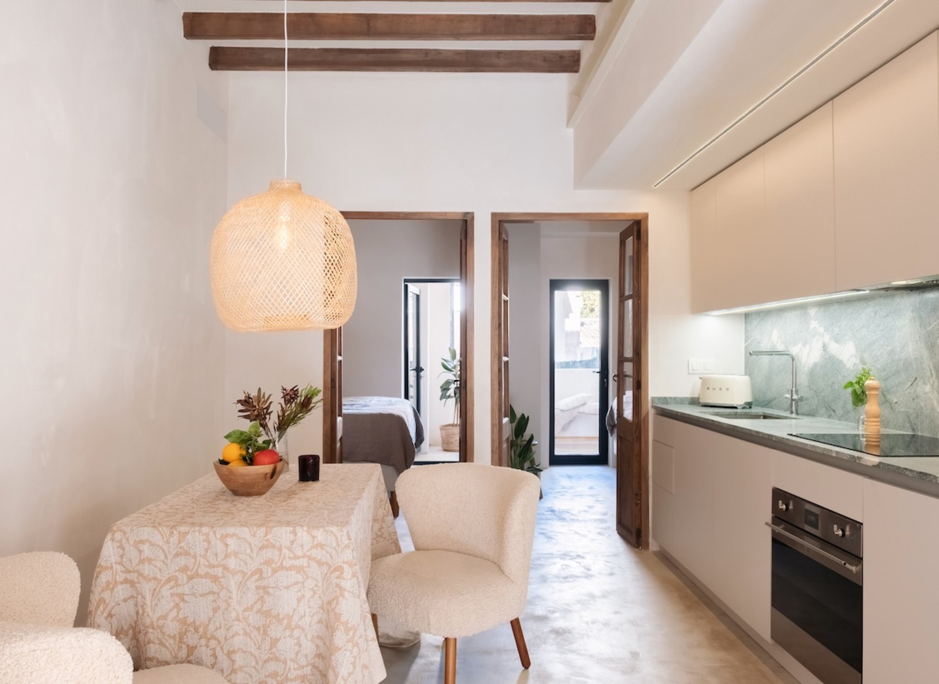 The sun-flooded, south-facing living area enjoys a semi open-plan kitchen and dining space, framed by high ceilings and beautifully exposed wooden beams. The kitchen stands out with its striking green marble countertop, adding character and sophistication. Micro-cement flooring runs seamlessly throughout, creating a smooth sense of unity and calm.